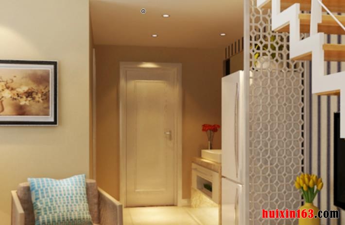 本案家居空间不是很大,但是由于户型为跃层,增加了纵向空间面积,加上开放式的空间结构设计,最大限度将空间优势展现了出来。浅黄色墙漆粉饰墙面,在灯光的照射下,整个家居给人温馨柔和的感觉。大大小小的装饰画随意的悬挂在沙发背景墙上,大小不等去不显得杂乱,装饰着背景墙,让背景墙看上去不再显得单调平素。米黄色花纹简约布艺沙发, 纯色及花纹两种靠枕装饰,在柔和灯光照射下,给人温馨雅致的感觉。浅色地板砖铺地,棕黄色地毯过渡,白桦木茶几,造型简约,美观实用。紫白两色相间的条纹墙纸装饰着电视背景墙,白色镂空雕花隔断将客厅与洗手间划分开,同时又不影响光线和视线的流通,电视柜造型简单、朴实简约,与背景墙搭配很是适合,整体感觉简洁明快、朴素大方。